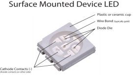 Surface Mounted Device chips (SMDs), have been developed for the use within various kinds of light sources such as strips, bulbs, downlights and tubes. Due to their small size, SMDs can be mounted flexibly into very small devices. SMD-technology allows an individual circuit design for each diode and two, 6 or even more contacts (diode and anode), hence allowing RGB and the creation of any possible colour.