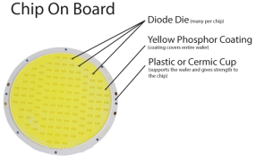 chip on board-technology (COB). Similar to SMDs on every COB chip there are multiple diodes, mostly 9 or more. Unlike surface mounted technology, COB-technology does not require a single circuit for every diode included on the chip, but can only have 1 circuit and 2 contacts for the entire chip regardless of the number of diodes. This single circuit design, regardless of the number of diodes on the chip, leads to simplicity for the rest of any COB LED device and to a higher luminous efficacy per Watt. However, individual levels of light output are not easy to adjust within COBs which is the reason why they cannot be used for colour changing lights.
